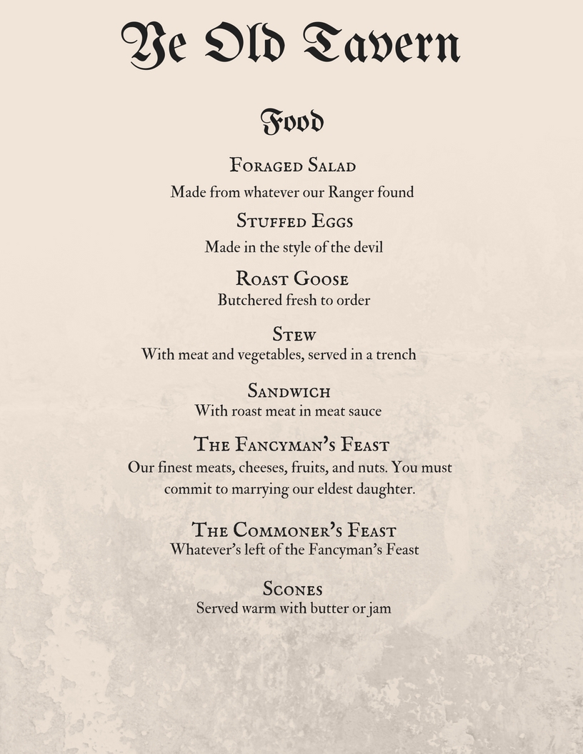 What items would you add to your Tavern menu? (Also, holy cow, read the comments. So much great insight and suggestions for other historically accurate menu items!)