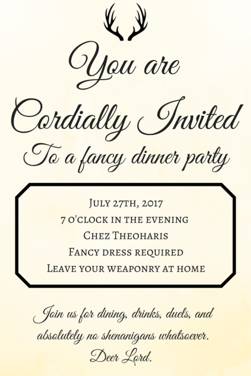 While you can easily play this game on its own, I wanted to throw a themed party around the idea of dueling your friends. And where else would you do that than the fanciest dinner party? (Exclaiming “Dear Lord!” whenever you catch your friends doing something out-of-the-ordinary was a ridiculously fancy bonus.) I emailed the following invitation to some of my most charismatic and daring friends: